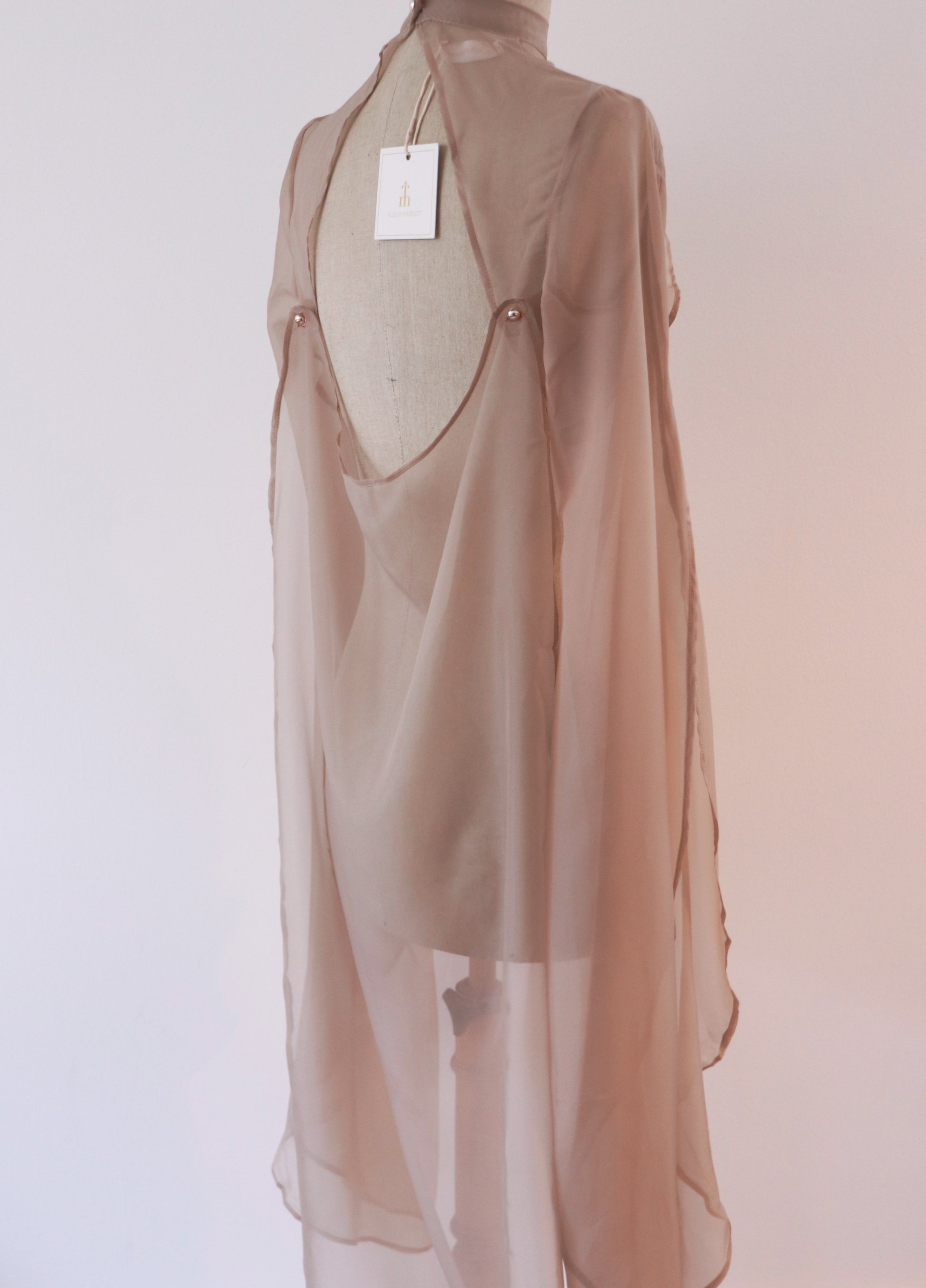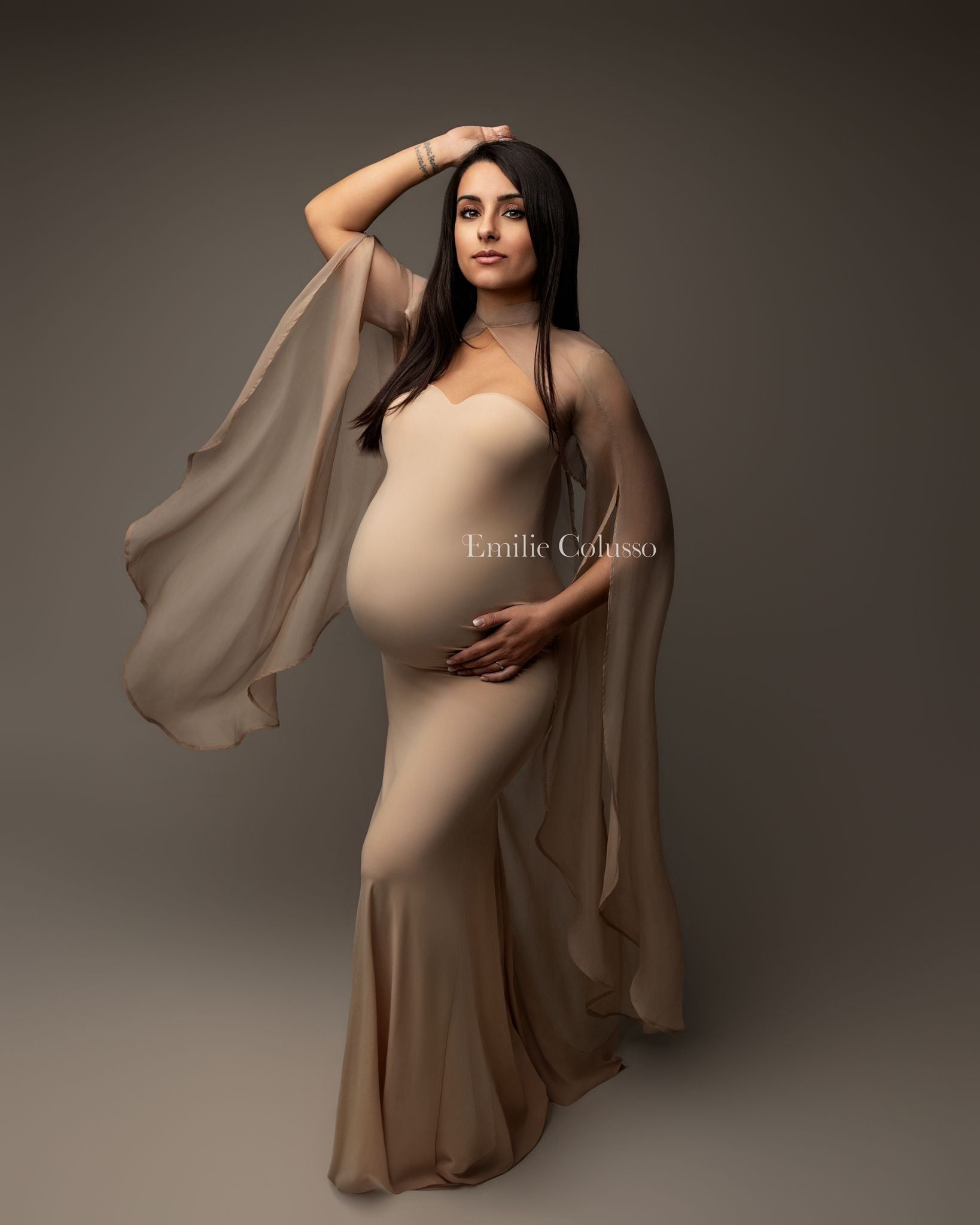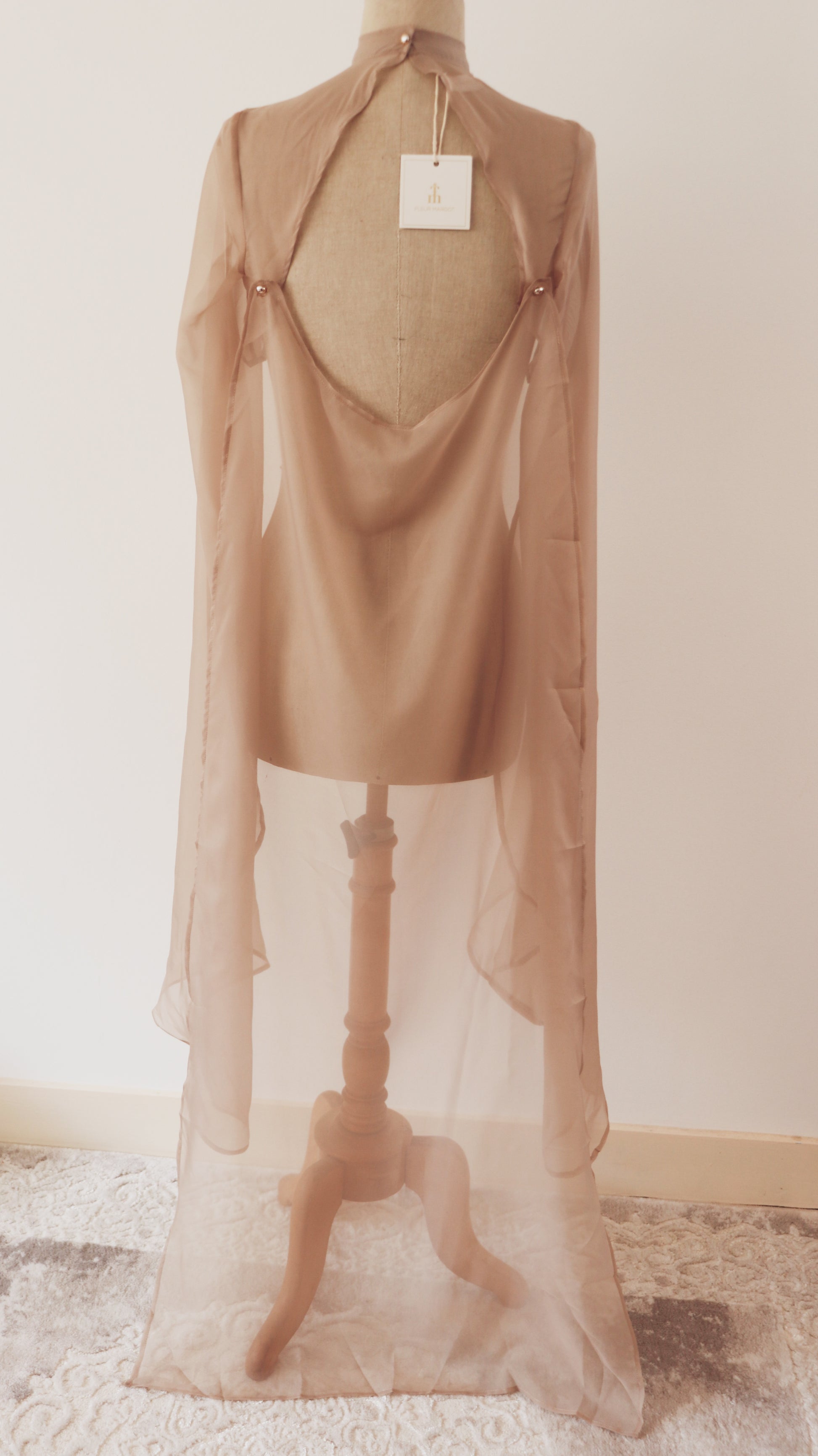 La capa Evelyne, confeccionada en organza suave, se envuelve con gracia sobre la mujer y ofrece un tacto suave y delicado. Perfecta para sesiones de maternidad o para realzar sin esfuerzo el conjunto diario de una mujer, cuenta con una capa extraíble en la parte posterior, lo que agrega versatilidad a su elegante diseño.
