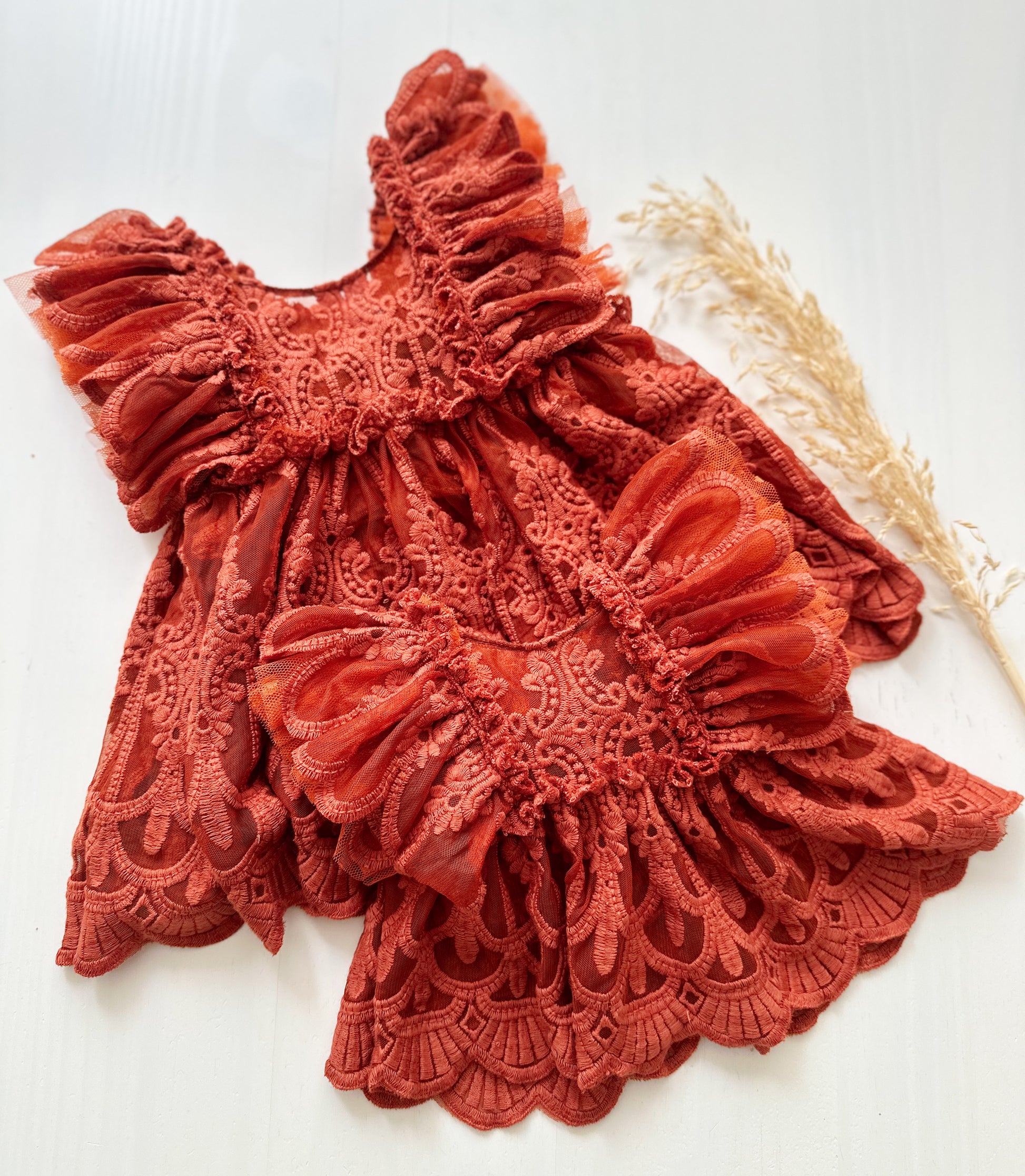 Presentamos nuestro vestido de terracota con encaje vintage y cubrepañal