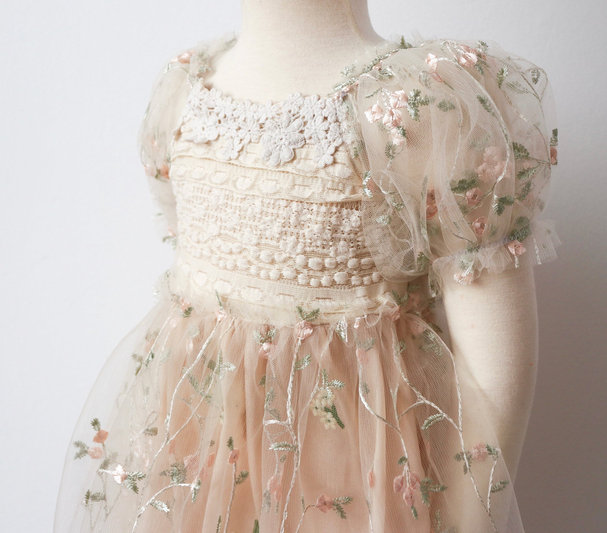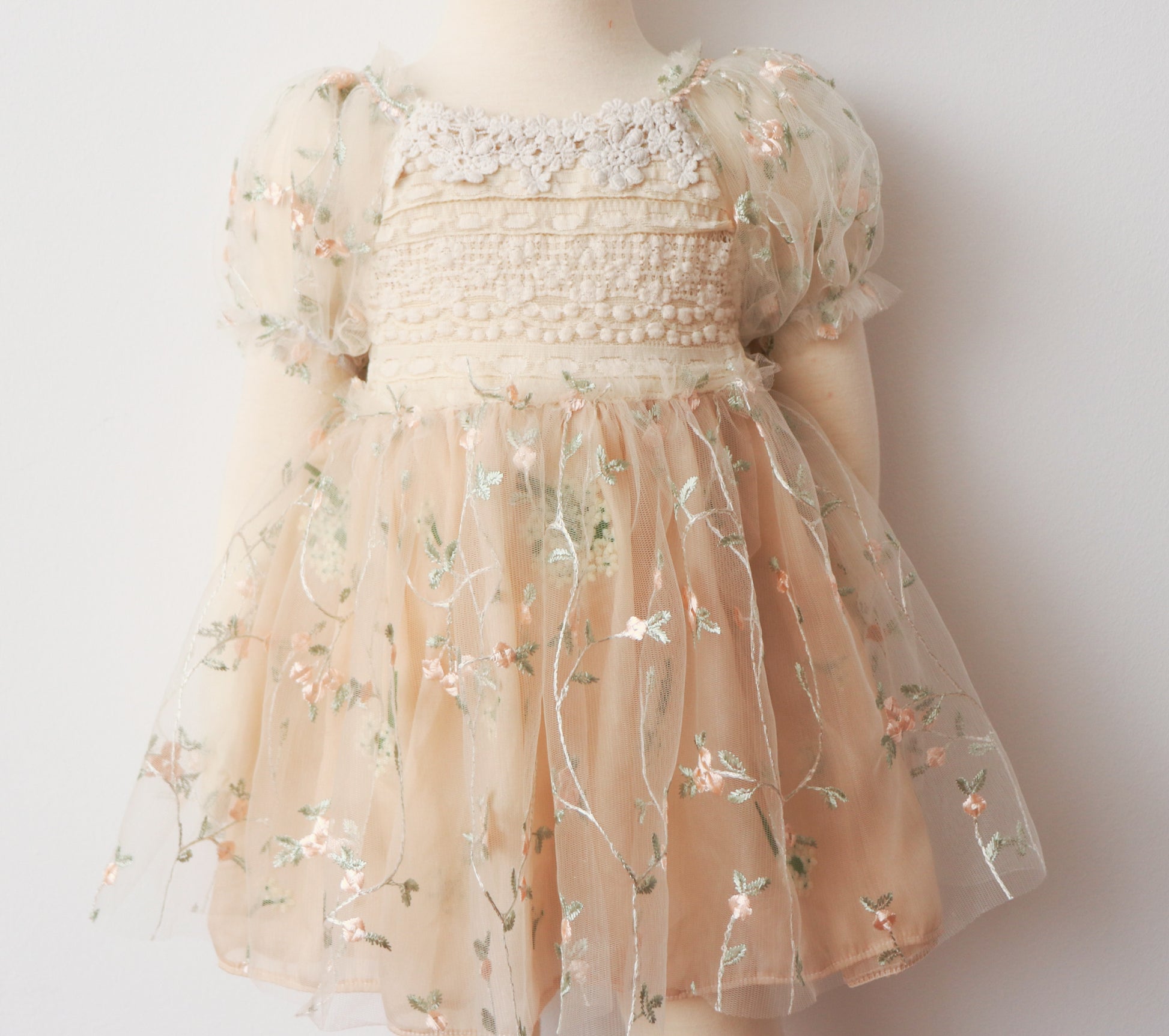 Discover the enchanting elegance of our girl’s dress, featuring a sophisticated beige lace bodice with intricate embroidery for a touch of timeless charm. This dress is designed to captivate with its whimsical and ethereal details.