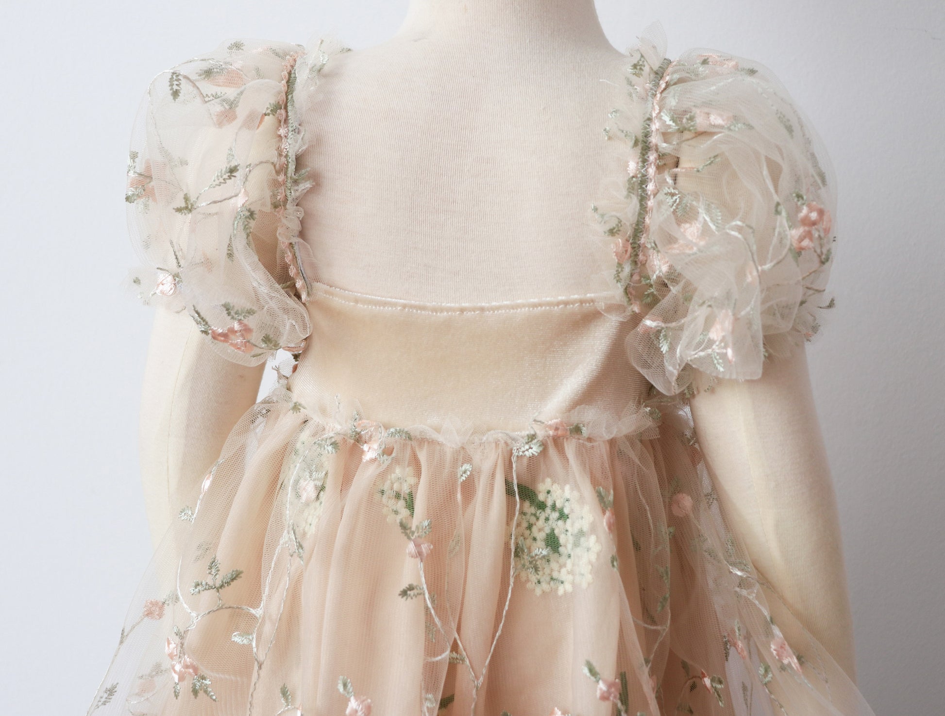 - Embroidered Tulle Puff Sleeves: Delicately embroidered tulle sleeves create a whimsical, fairy-tale look that’s both dreamy and enchanting.